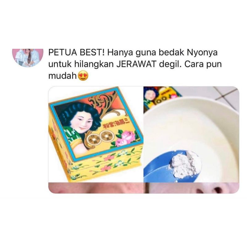 Produk penjagaan wajah yang mahal sebaliknya rahsia kecantikan hanya dengan penggunaan bedak sejuk cap nyonya namun kini tak ramai men. Selain flawless, boleh jadi solusi hilangkan jerawat Guarantee authentic or money back. Campurkan bedak sejuk nyonya dengan asam jawa dan air. Untuk mengatasi masalah jerawat, bintik hitam, memutihkan kulit: